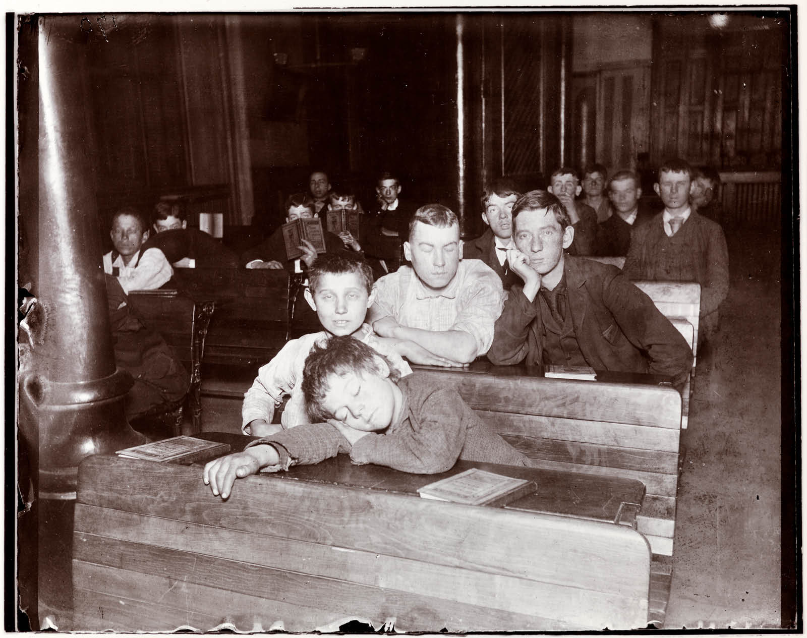 Den sovende 9-årige Edward var forældreløs men tjente sine egne penge som råber for en dørsælger. Edward var faldet i søvn på skolebænken i aftenskolen i herberget på Seventh Avenue fuldstændig udmattet efter en lang dags arbejde.